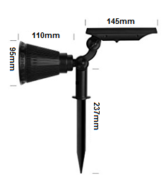 Belysning LED sol strålkastare 2WDen soldrivna trädgårdsstrålkastaren med LED kommer att bli ett både praktiskt och dekorativt tillskott i trädgården tack vare sin stilrena och moderna design. Denna lampa kan enkelt installeras med hjälp av det medföljande markspettet. Det behövs inte någon kabel eller sladd, då allt du behöver är tillräckligt med solljus för att ladda det utbytbara batteriet via solpanelen. Stålkastarens belysningsvinkel kan justeras. Lampan lyser i cirka 6 timmar, beroende på antalet soltimmar den dagen.