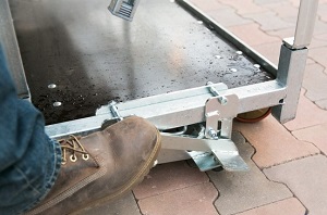 Genom att stå på handtaget lyfter bromsen svänghjulen från golvet och förhindrar vagnen att röra sig. För att ta bort vagnen från bromsen, kan du trycka på handtaget igen. På så sätt kan du enkelt säkra din vagn utanför din blomstermarknad.
